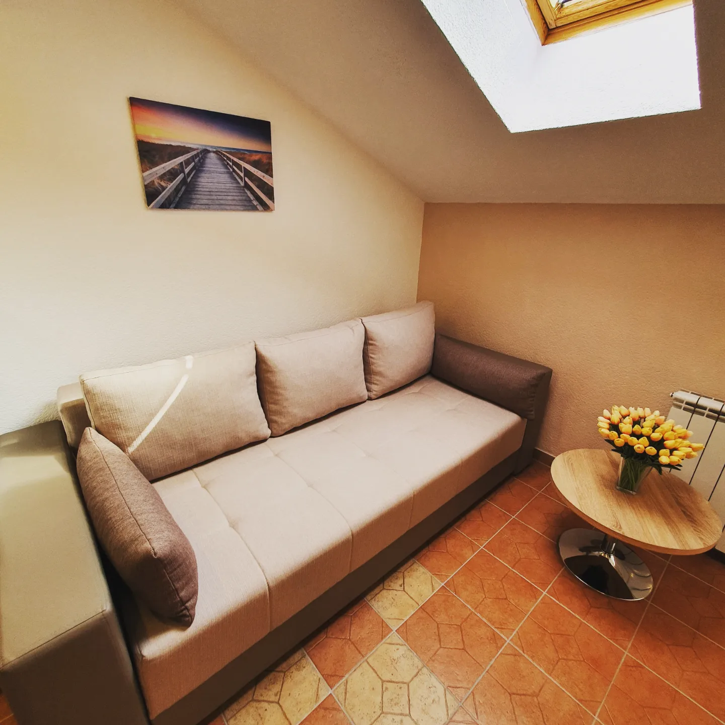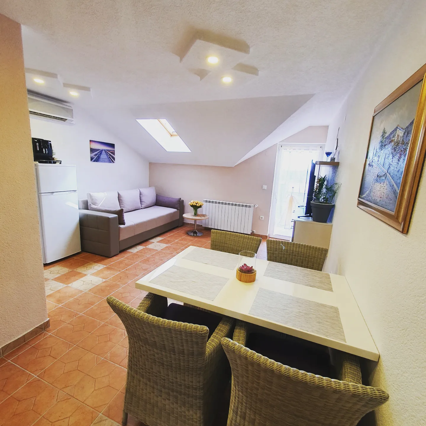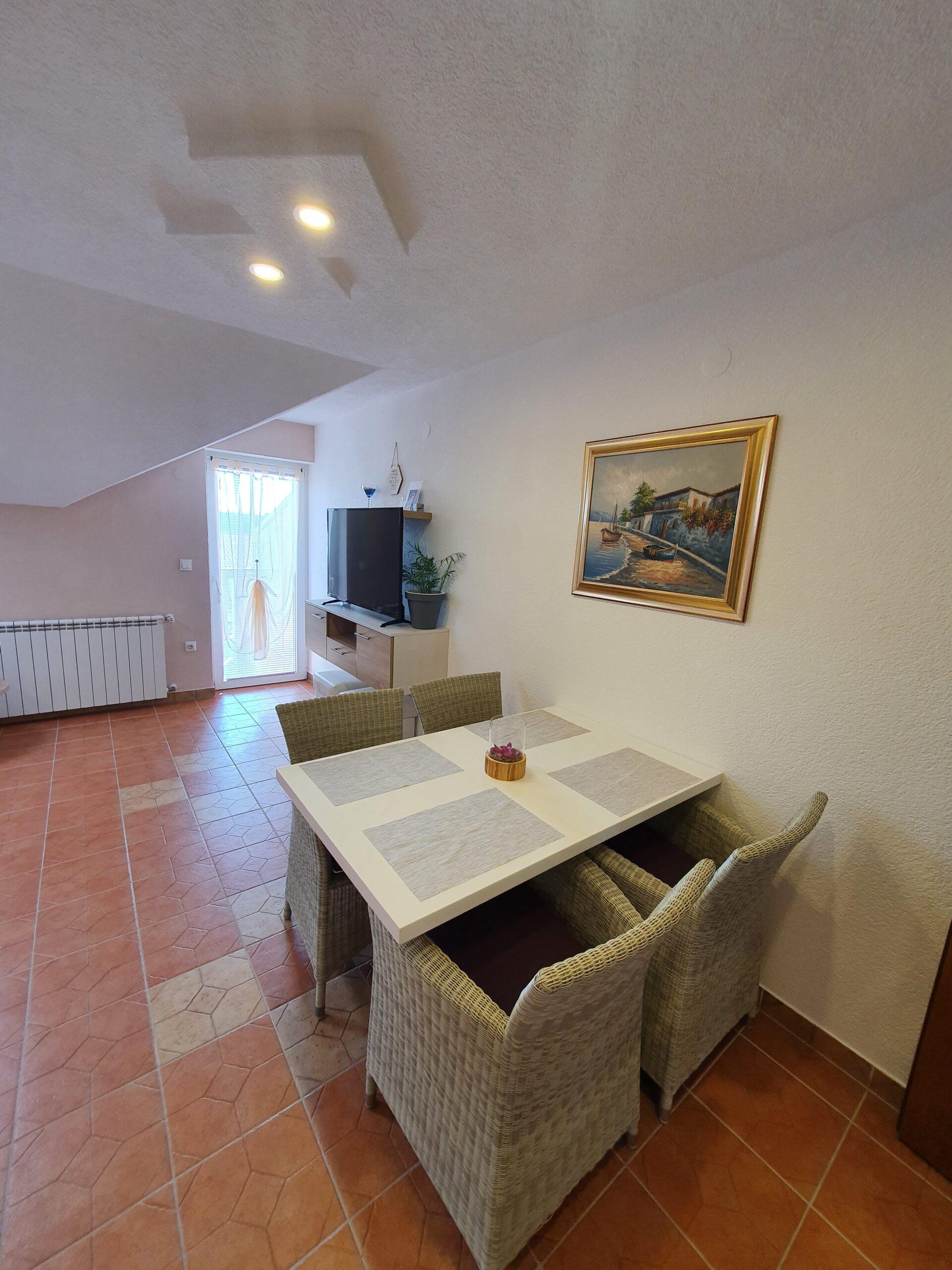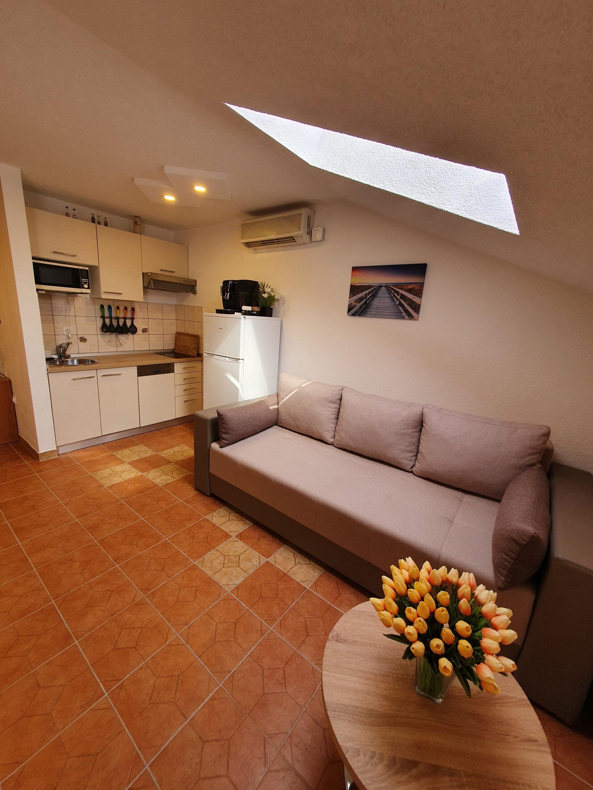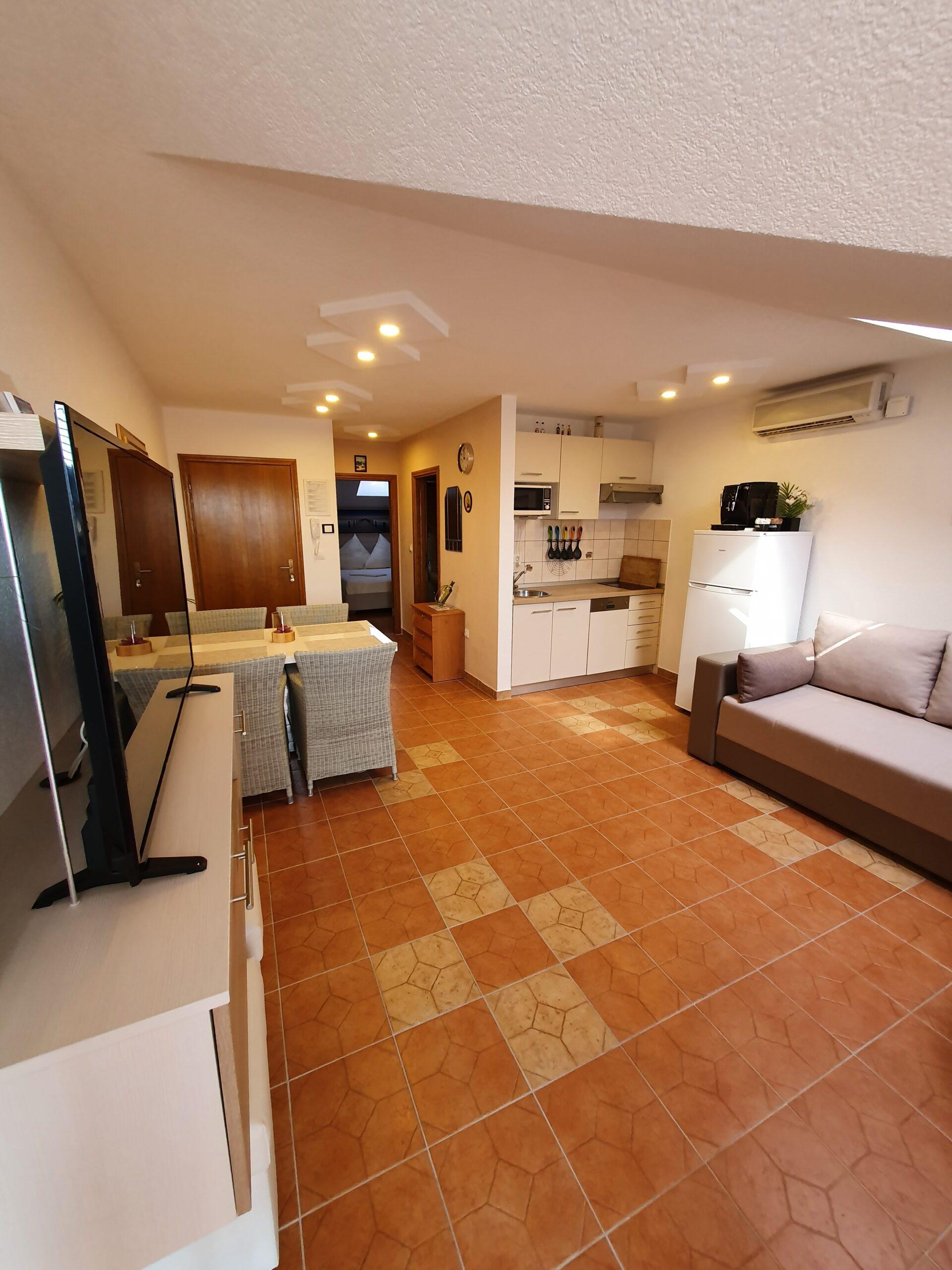 Ovaj apartman je idealan za 4 osobe (2+2). Sastoji se od jedne spavaće sobe s duplim krevetom (160×200),kupaonicom,kuhinjom i dnevnim boravkom sa udobnim ležajem na razvlačenje(180×200). Ovaj Apartman ima i balkon koji je opremljen vrtnim namještajem.
