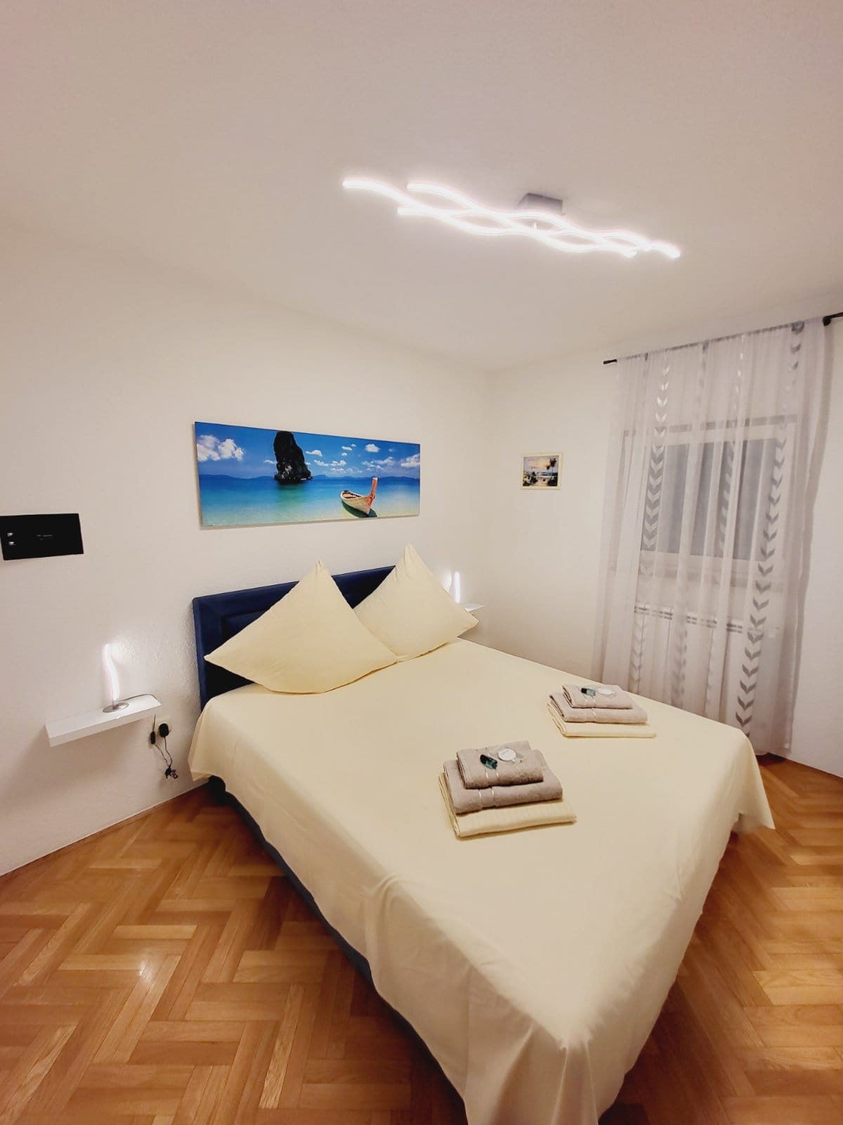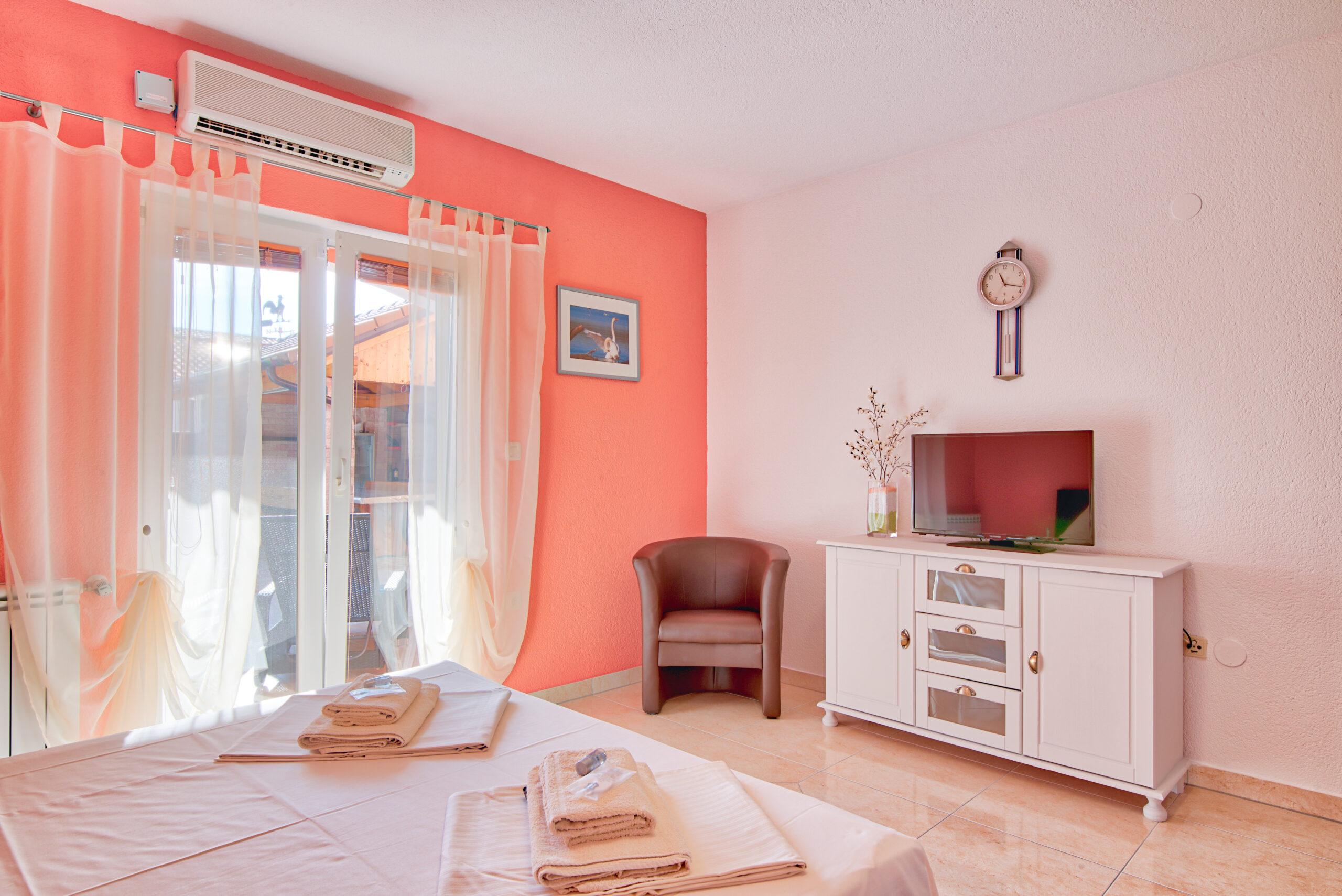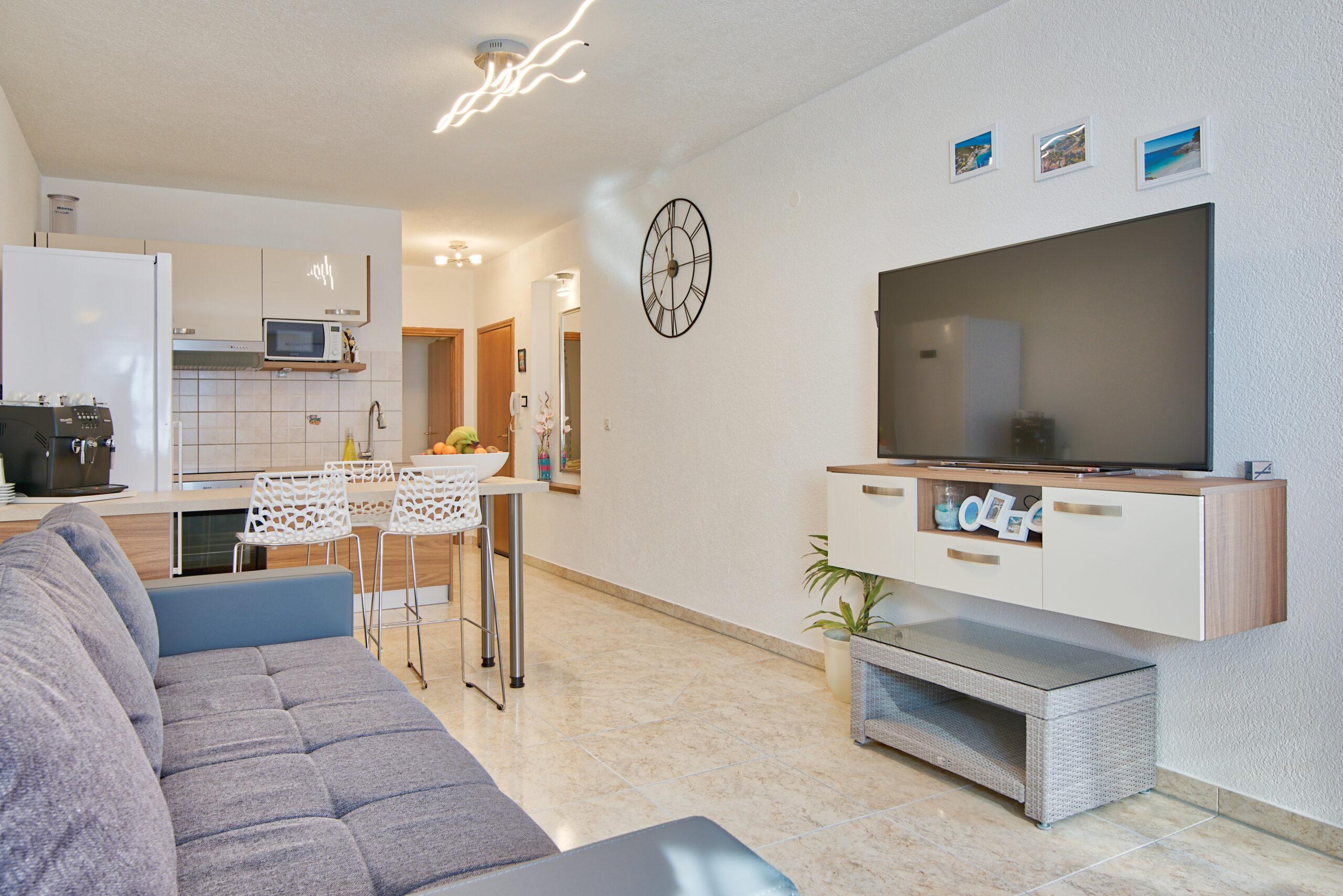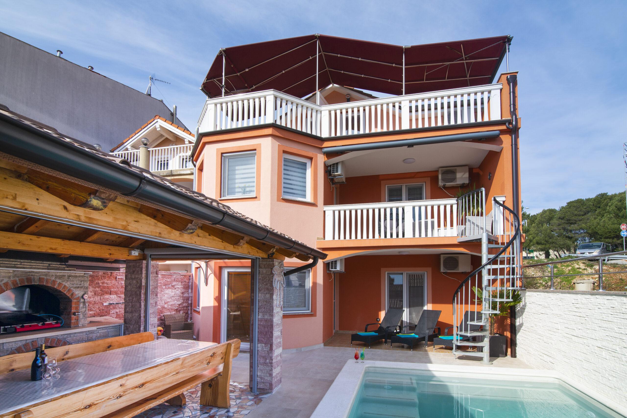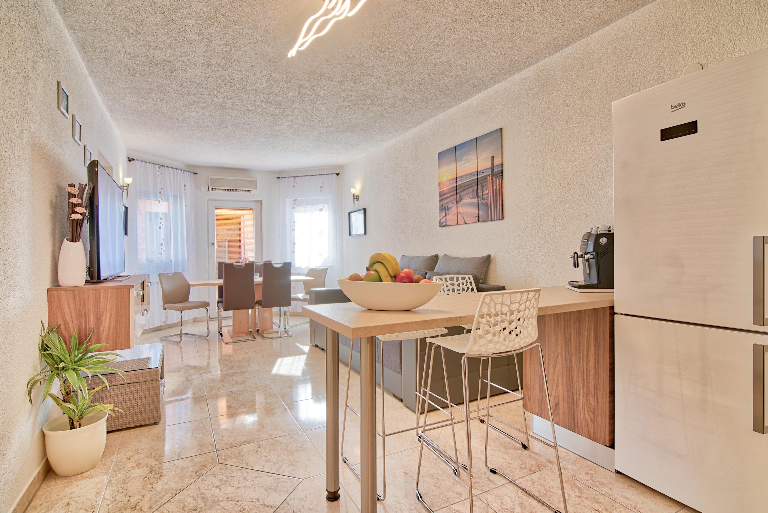 Stan koji je idealan za 6 osoba. Sastoji se od tri spavaće sobe,dvije kupaonice,prostranom kuhinjom i dnevnim boravkom za potpuni komfort. Stan koji je idealan za 6 osoba sastoji se od tri spavaće sobe,dvije kupaonice,prostranom kuhinjom i dnevnim boravkom za potpuni komfort. Uz taj stan pripada i bazen sa slanom vodom koji ima toplinsku pumpu za uživanje u ranim i kasnim ljetnim mjesecima. Tu je i grill kućica opremljena vrtnim namještajem i plinskim roštiljem za druženje i pripremanje slasnih obroka sa vašom obitelji ili prijateljima.